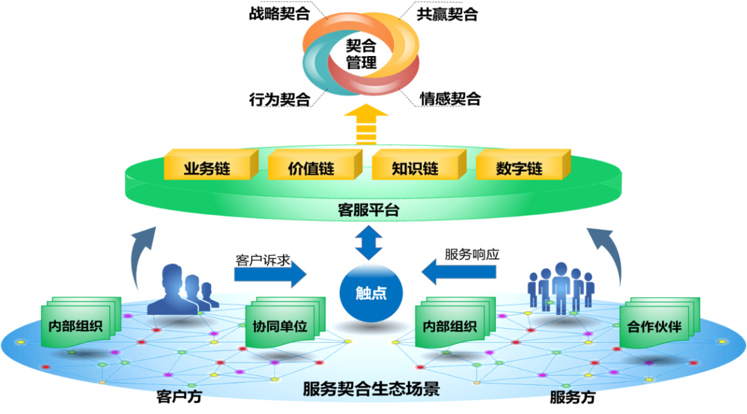 依据触点数据和企业运营管理数据,可以定量评测行为契合和情感契合评价指标。行为评价包括了产品可用性、合同履约、投标、回款等内容,评估服务团队通过产品提供是否在合同约定下,满足了客户的需求,并实现客户与企业的价值双赢。行为契合评价的一个重要表现特征是:客户重复购买意向、交叉购买意向和推荐意向。情感评价包括客户回访、现场服务、第三方满意度调研等内容,客观评价分析各产业单位、各产品线的客户满意度情况。情感契合评价的一个重要表现特征是:客户购买的第一选择、抵制改变购买意愿和价格变化的容忍度。在行为评价和情感评价的基础上,通过生态场景、行业地位、社交互动,以及知识贡献和价值共创等向量数据关联分析,建立共赢契合评价、战略契合评价的多层级评价指标。促进企业客户服务从产品导向、客户导向、品牌导向、价值导向到价值观与价值共创导向,使企业与客户之间变成一个价值共生的整体,达到企业与客户的共赢契合、战略契合。