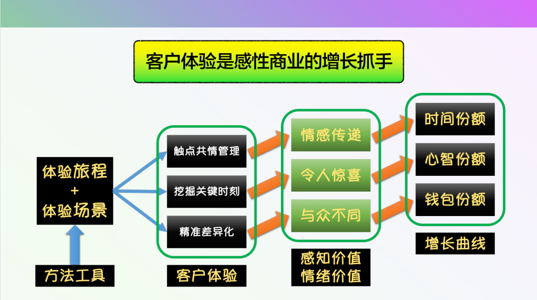 通过体验旅程与体验场景的方法结合,到客户体验实施的三大落地法则,并传递给消费者和客户正向的感知和情绪,最终对于企业来说,就是实现了期望的增长曲线,也就是抢占了客户在你企业和品牌上的决策心智。